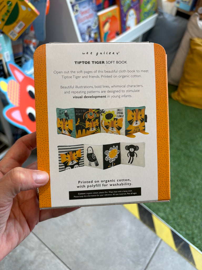 Unravel this beautiful organic cloth book and follow Tiger as he tip toes through the day, taking care around the spring flower, and listening out for the monkey and bird.