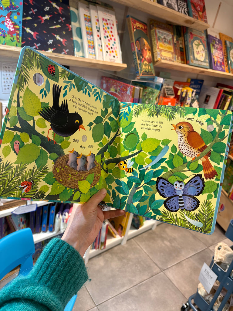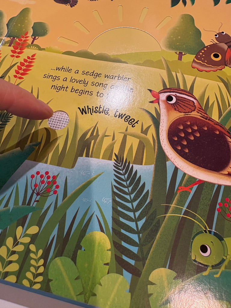 Little children will love hearing the birds sing as they press the pages of this enchanting book. Each beautifully illustrated scene has simple text and cut-out shapes to discover, and a sound button to press to hear different bird sounds including baby blackbirds tweeting, a magpie chattering, ducklings quacking and a cuckoo singing.