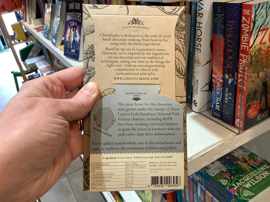 The cacao beans for this chocolate were grown under the canopy of Sierra Leone’s Gola Rainforest National Park. Various charities, including RSPB, have been working with local farmers to grow the cocoa in harmony with the park rather than drive deforestation.