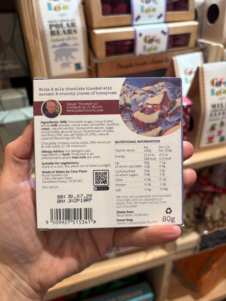Ingredients: Milk Chocolate (sugar, cocoa butter, whole milk powder, cocoa mass, emulsifier: lecithins (soya), natural vanilla), honeycomb pieces: sugar, cocoa butter, glucose syrup, bicarbonate of soda, rice flour (3%), sea salt flakes (0.25%), natural caramel flavouring (<0.1%).