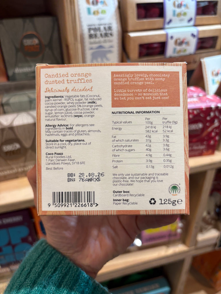 Rich chocolate orange truffles by Coco Pzazz with zest candied orange peel and a dusting of pure cocoa powder.