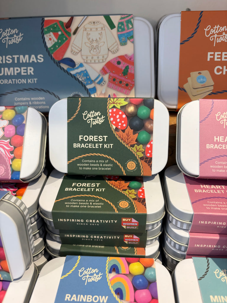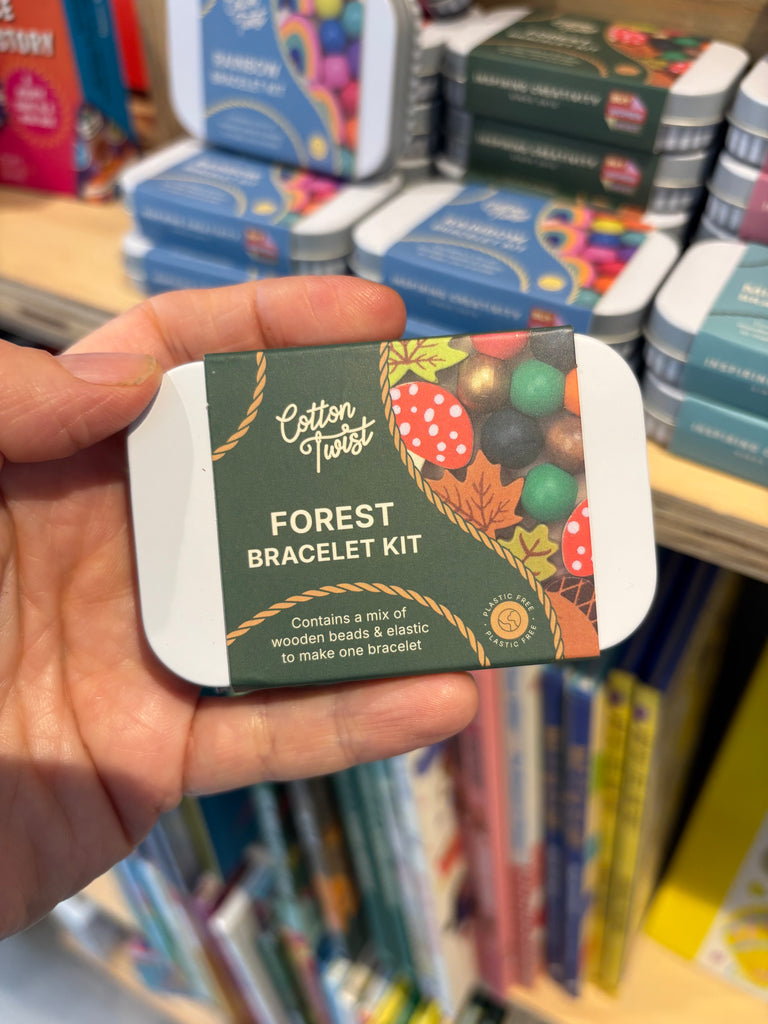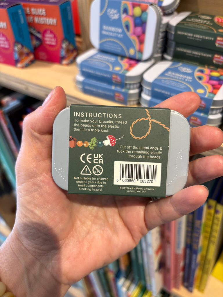 A beautiful gift tin containing elastic & beads to create this forest bracelet. The elastic comes with hard ends to aid the beading process for young children. Then, patience & precision are all that's required to assemble this piece.