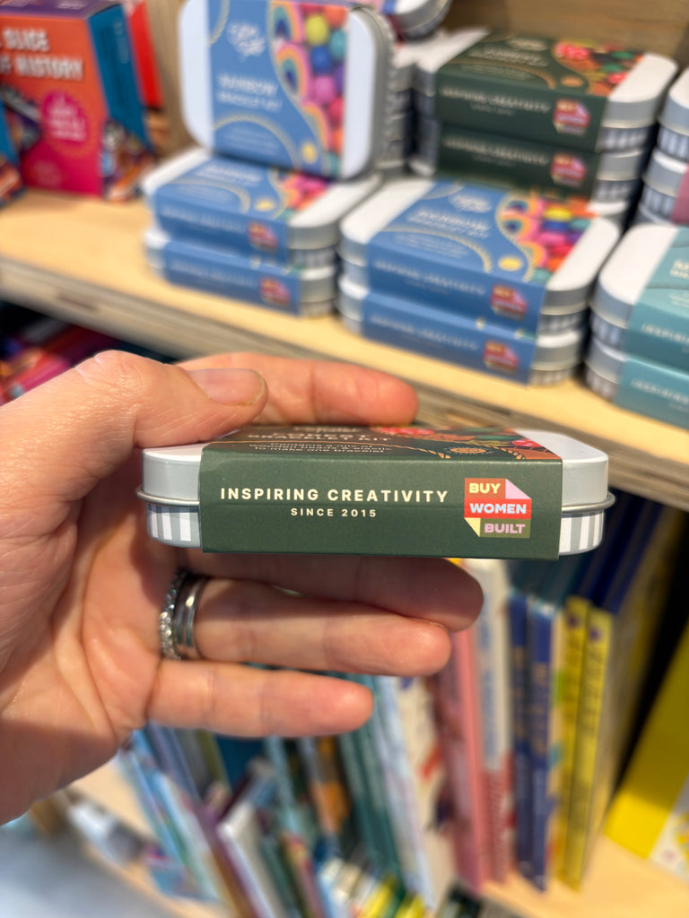 The kit is presented in a rectangular tin which can be used to store the bracelet, or a special trinket. They are also perfect as wedding day activities, party bag fillers, stocking fillers & gifts.