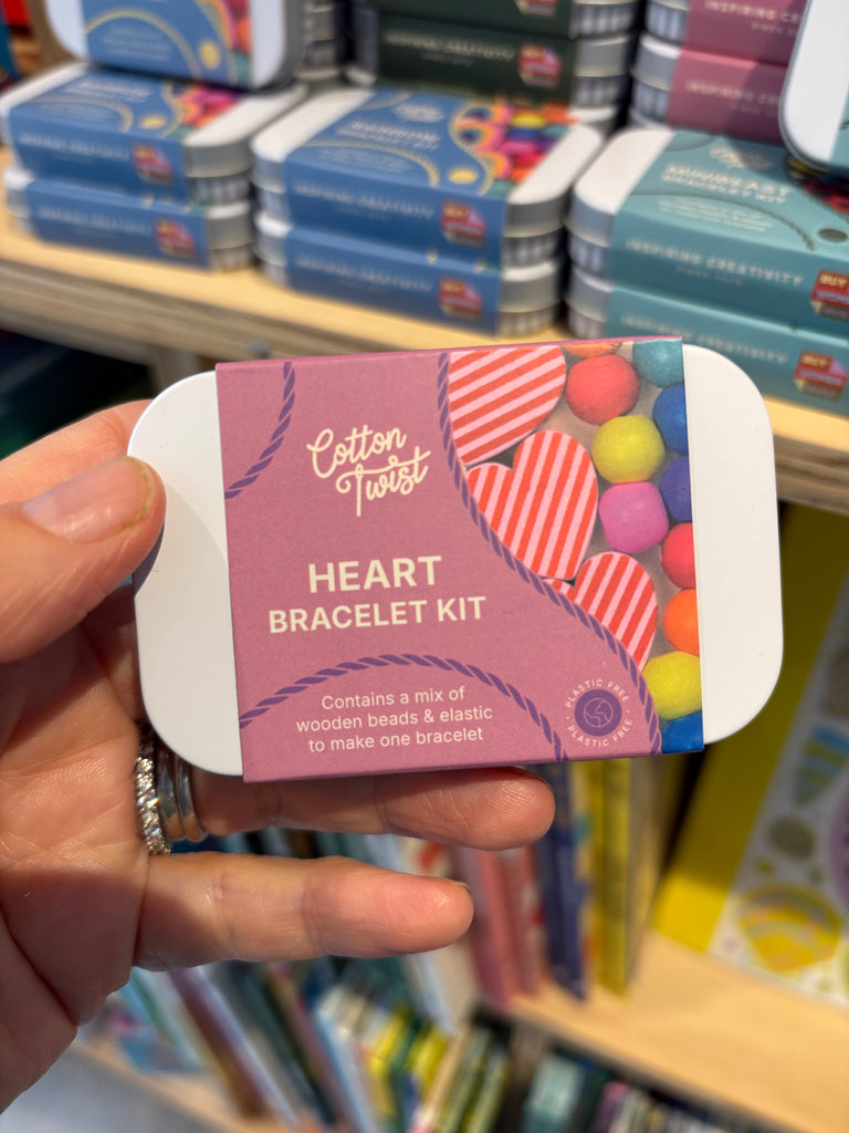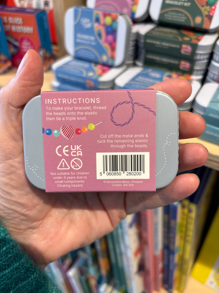 A beautiful gift tin containing elastic & beads to create a heart bracelet fit for a princess. The elastic comes with hard ends to aid the beading process for young children. Then, patience & precision are all that's required to assemble this piece.