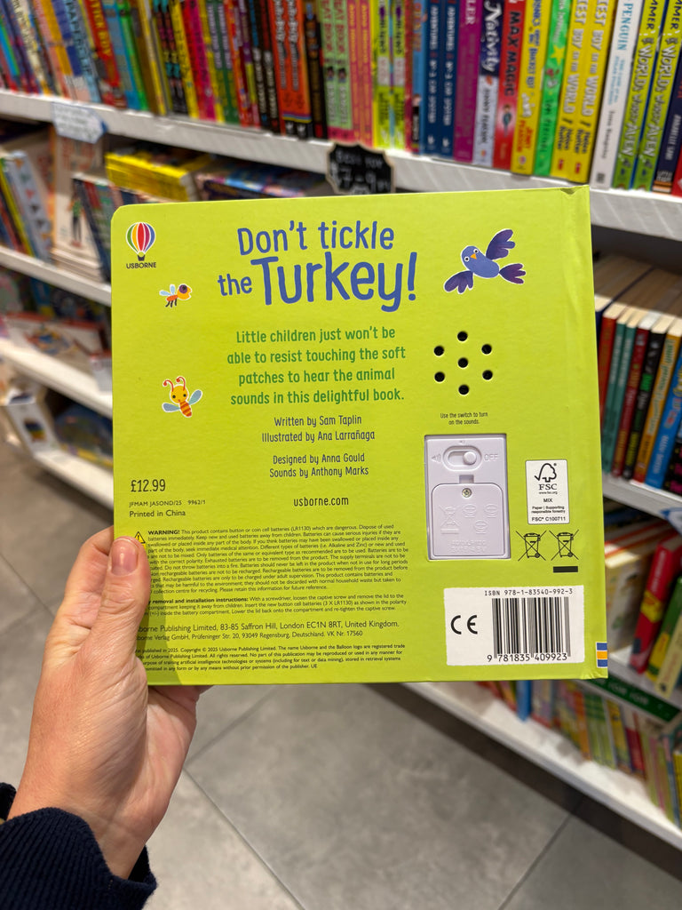 You'd better not tickle the turkey... because it might just go "gobble" if you do! Babies and toddlers just won't be able to resist tickling the touchy-feely patches to hear each animal make a sound in this hilarious novelty book. At the end, readers will find all the animals being noisy at once in a musical finale guaranteed to get little ones dancing along.