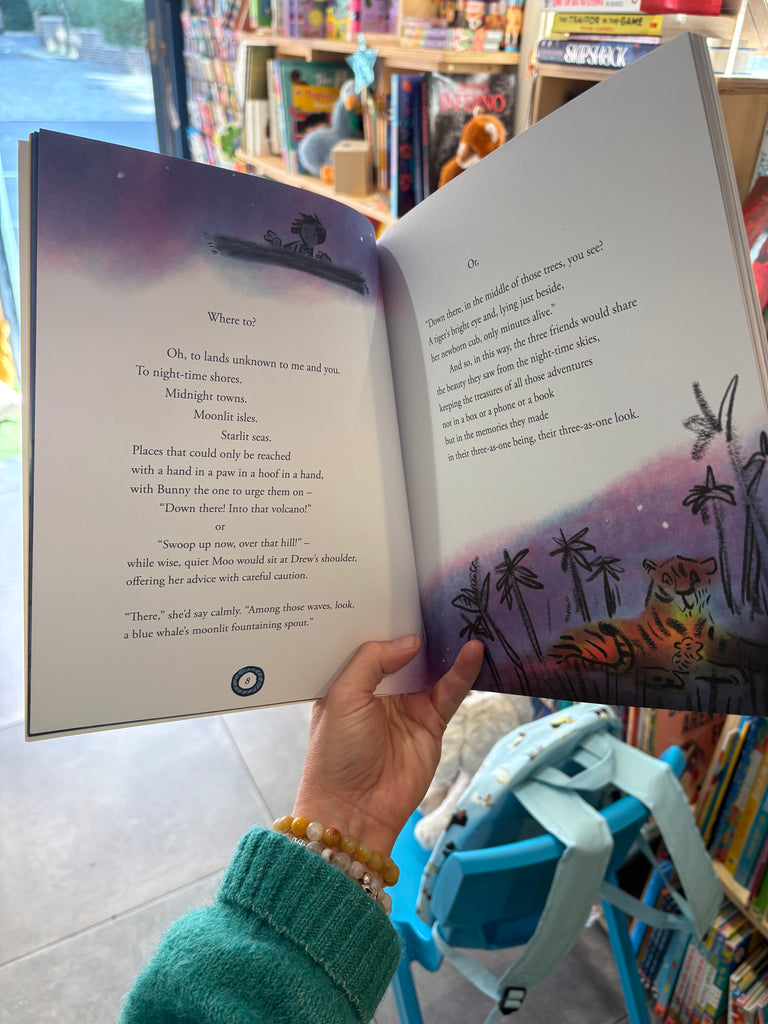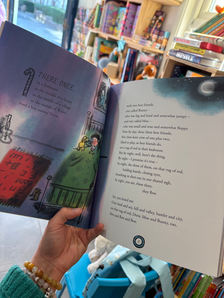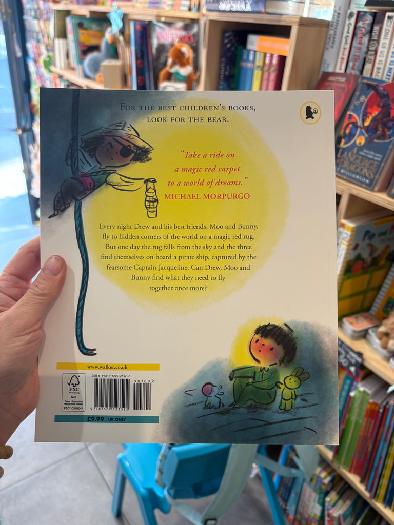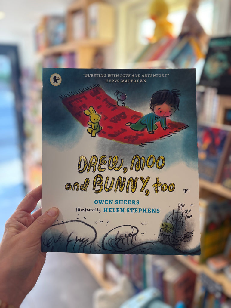 A beautiful, lyrical story of a little boy and his two best friends, told in enchanting verse by renowned poet Owen Sheers and magnificently illustrated by award-winning artist Helen Stephens. Poet Owen Sheers and award-winning illustrator Helen Stephens have beautifully imagined the story of a little boy named Drew who sets off on an adventure with his best friends, Bunny and Moo. As the three fly around the world on a magic rug, powered by the friendship they share, they run into pirates and trouble on the dark sea.