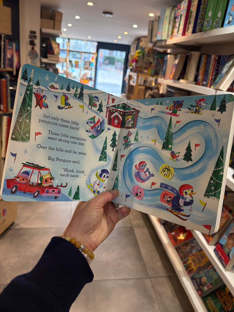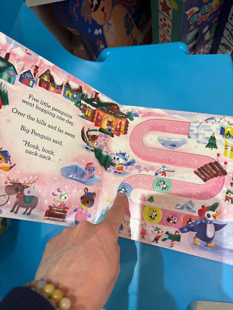 Slide the buttons along the icy paths to count the little penguins in this fun festive twist on the popular nursery rhyme, Five Little Ducks. Little children will have huge fun moving the buttons around the page to make Big Penguin's little penguin chicks waddle, skip, sledge and slide through the snow! A counting book like no other, the irresistible and hugely satisfying interactive element makes Five Little Penguins the perfect way to introduce preschoolers to counting. With richly detailed snowy scenes that are packed full of details to spot and cute characters all along the way, illustrated by the hugely talented Jill Howarth.