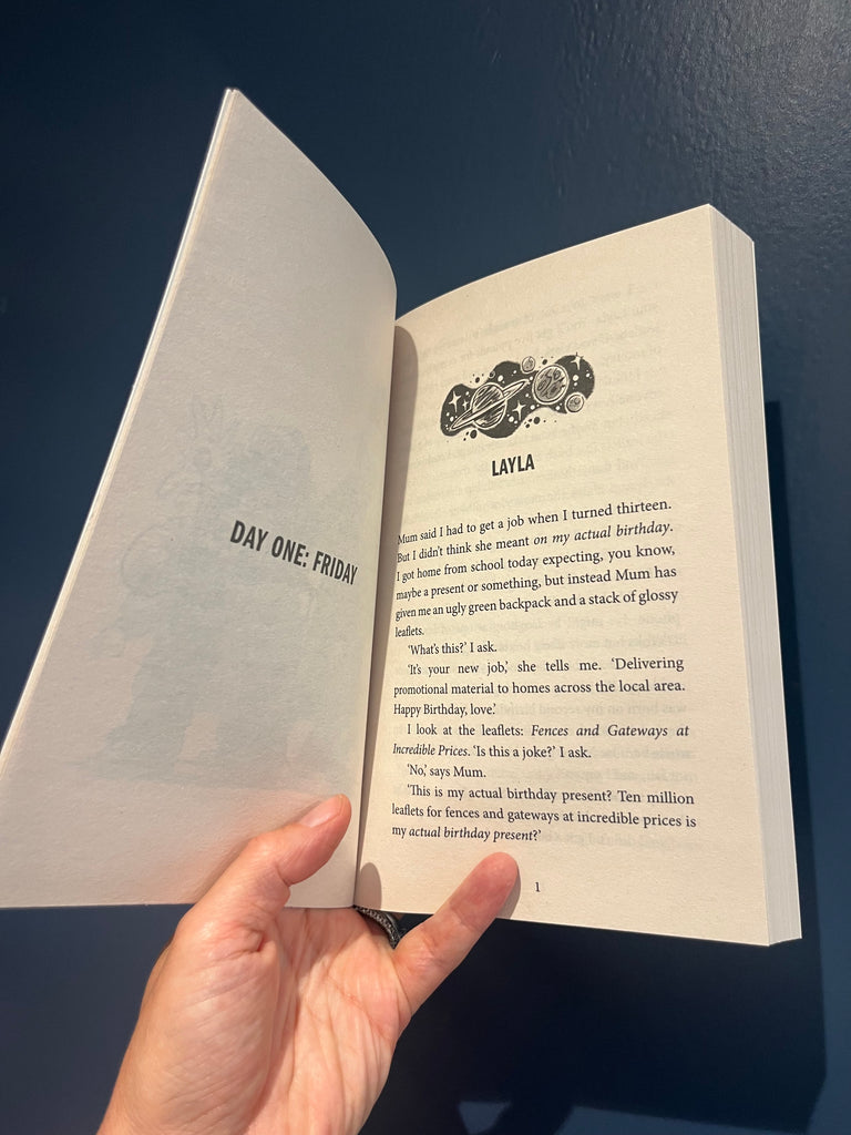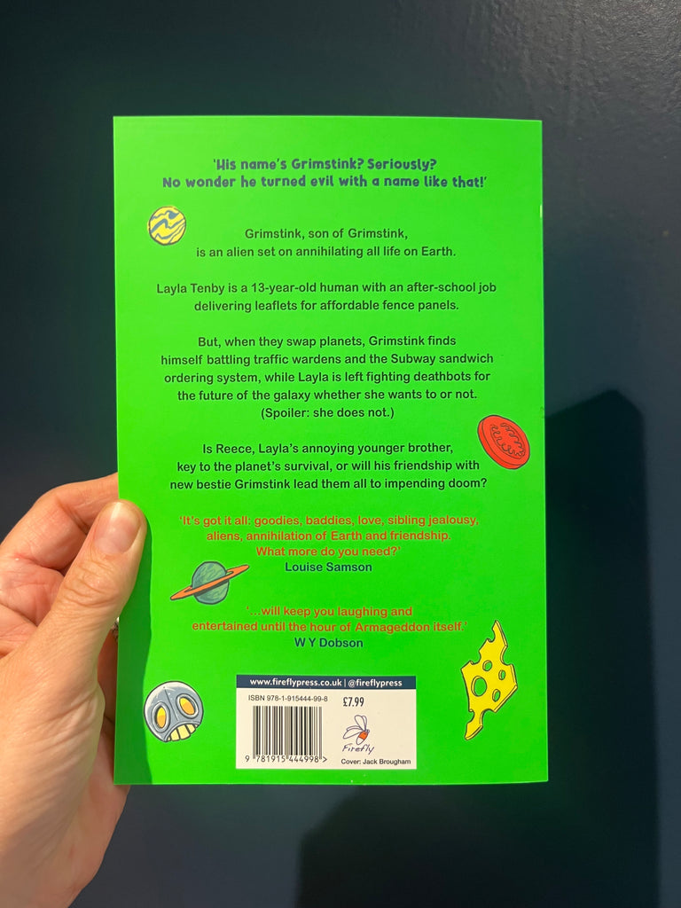 Alien Grimstink has travelled ninety thousand light years to annihilate all life on Earth. 13-year-old Layla Tenby has travelled half a mile to deliver leaflets for affordable fence panels. But when they swap places Grimstink finds himself battling traffic wardens and the SUBWAY sandwich ordering system, while Layla is zapped to a strange planet and left fighting for the future of the galaxy whether she wants to or not (spoiler: she does not want to).