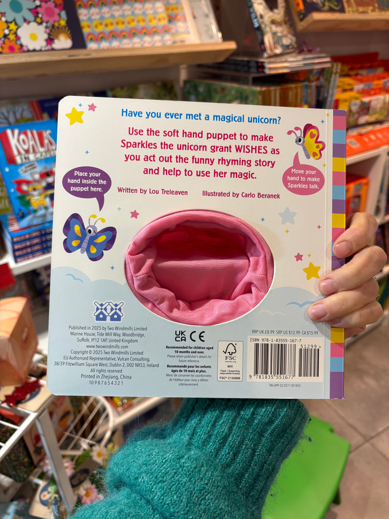 Simply place your hand inside the puppet and move your fingers and thumb to act out the story and bring Sparkles the Unicorn to life!
