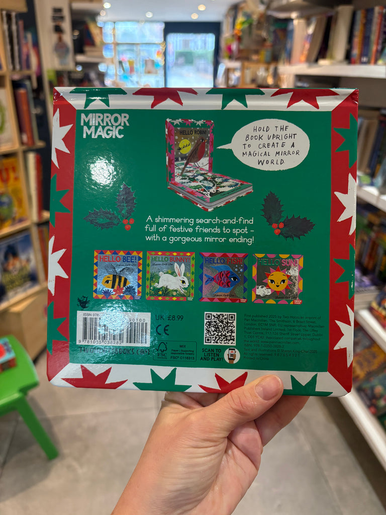 The perfect Christmas gift for little ones, with festive treats to spot, shiny mirror on every page and a gorgeous mirror ending, and a free audio download via the QR code. Babies and toddlers will love finding the jolly delights on each reflective page in this unique mirror book, full of bold shapes, high contrast colours and new words to enjoy. The shiny mirrors and bright colours are ideal for tummy time and sensory playtime, catching the eye and keeping little ones engaged at Christmas as they say hello and bye bye – then find themselves in the mirror at the end!Mirrors on every page extend the landscape – hold the book upright to create a magical mirror world to explore!Download the bonus audio for free to listen along and learn new words as the book is read out loud, then read again to enjoy a bonus audio spotting game!Wander into a bright and beautiful winter wonderland with Sharon King-Chai, the award-winning illustrator of Julia Donaldson’s Animalphabet and Counting Creatures.