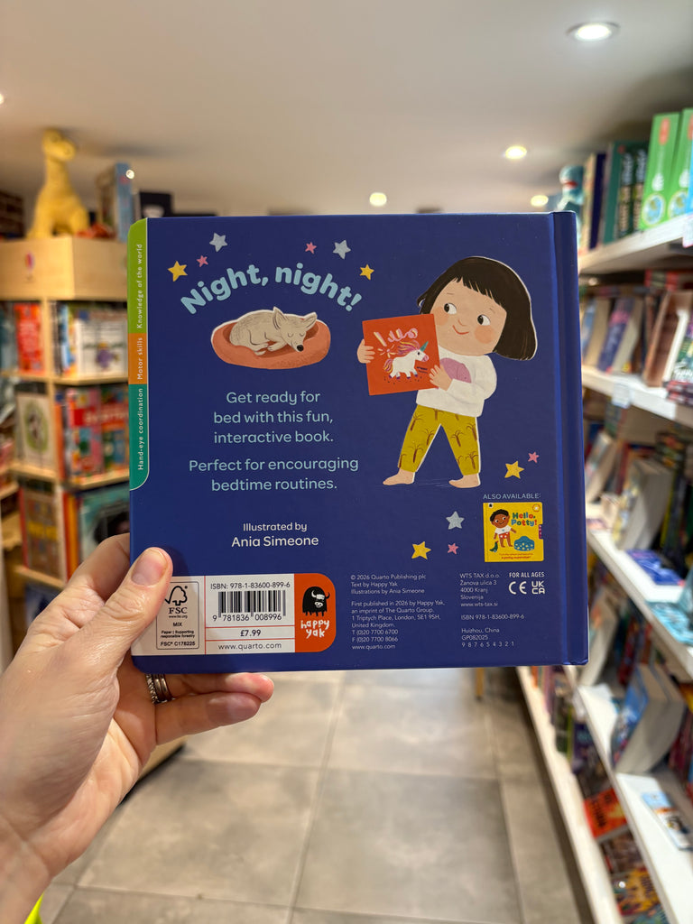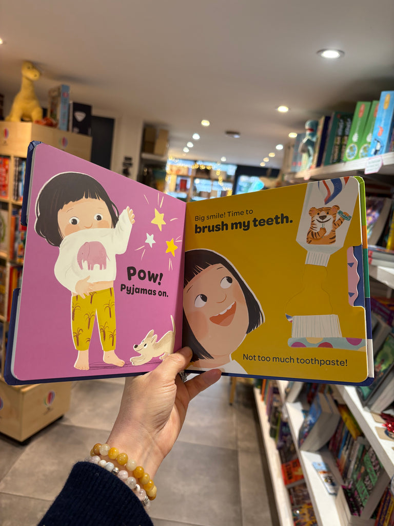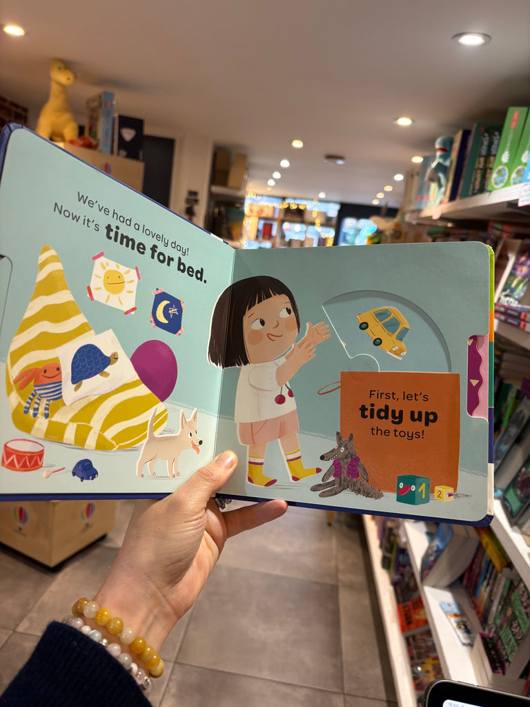 Get ready for bed with this fun, interactive board book. What better way to engage your toddler with bedtime than by making them laugh, then calmly settling them down before sleep? Kids will love turning the wheel to tidy up the toys, squirting water from a bath toy, squeezing toothpaste from the tube, choosing a book for storytime, picking a bedtime toy, and then gazing at the stars and moon together.