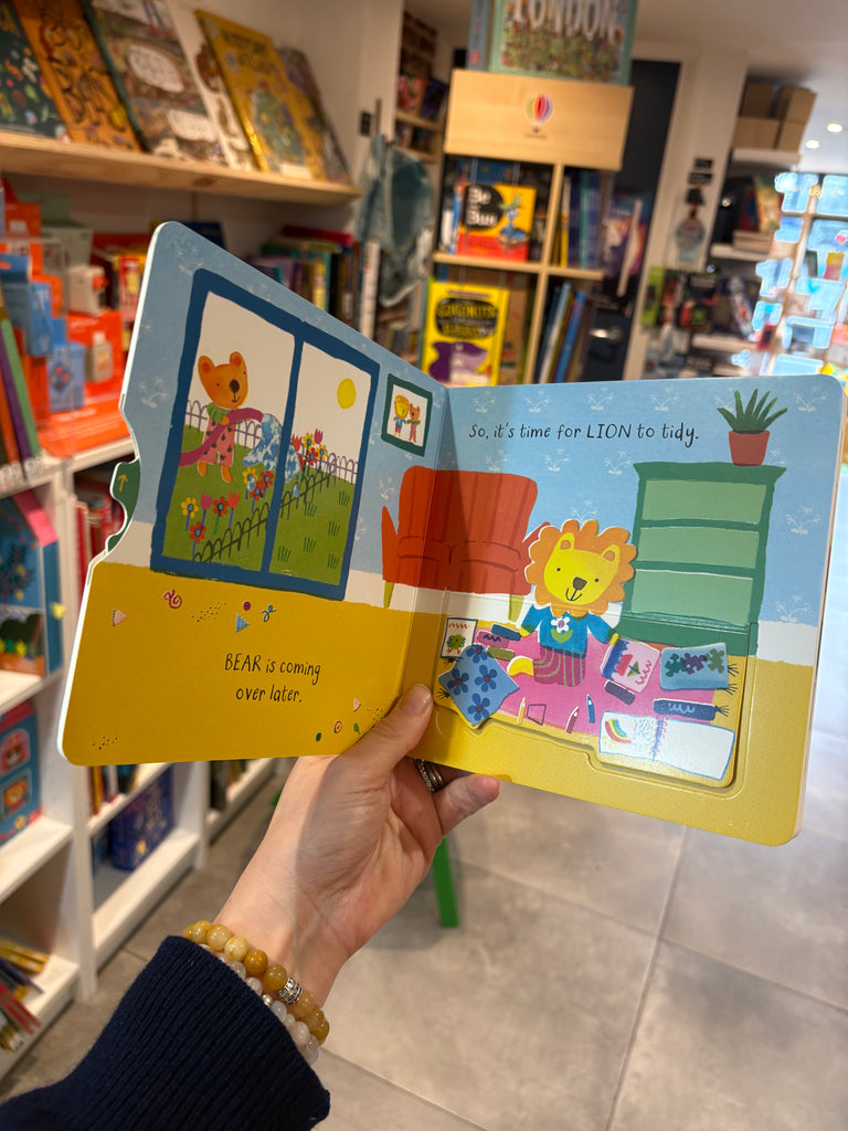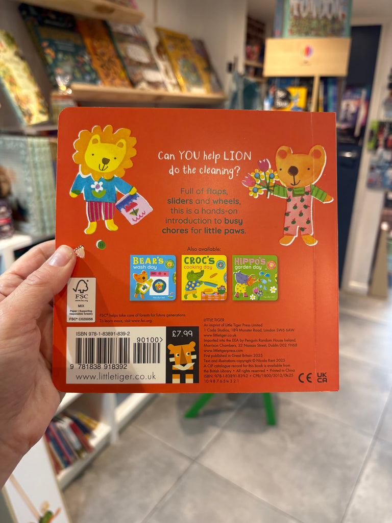 Can YOU help Lion do the cleaning? Follow Lion around the house as he tidies up, does the hoovering and cleans in the dishes in this delightfully interactive board book. Full of novelties for little hands, including flaps, sliders and wheels, it's a charming and hands-on introduction to the grown-up tasks that fascinate toddlers. With engaging text that lends itself perfectly to repeated reading and characterful illustration from Nicola Kent, Lion's Cleaning Day is the ideal book for any little one who has ever wanted to get involved with what the grown-ups are doing!