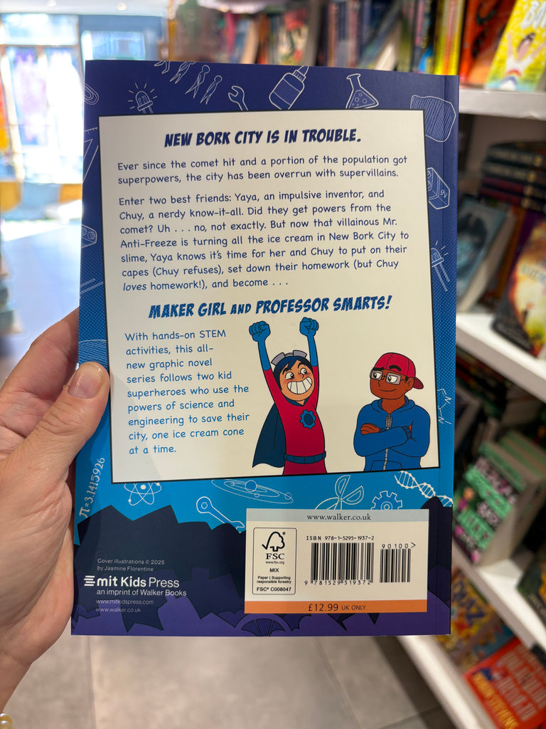 Two kid heroes use brains and elbow grease to face off supervillains with hilarious powers in this all-new STEM graphic novel series from MIT Kids Press. Ever since a comet hit Earth, New Bork City has been overrun with supervillains! Luckily, Maker Girl – who can make just about anything – and Professor Smarts – the sharpest kid on the block – are here to put a stop to them. They may not have superpowers of their own, but with the powers of science and engineering, they are more than a match for Mr Anti-Freeze, who's bent on destroying all ice cream, and Queen Ka-Ching, who kidnaps the heroes and brings them to her evil lair...