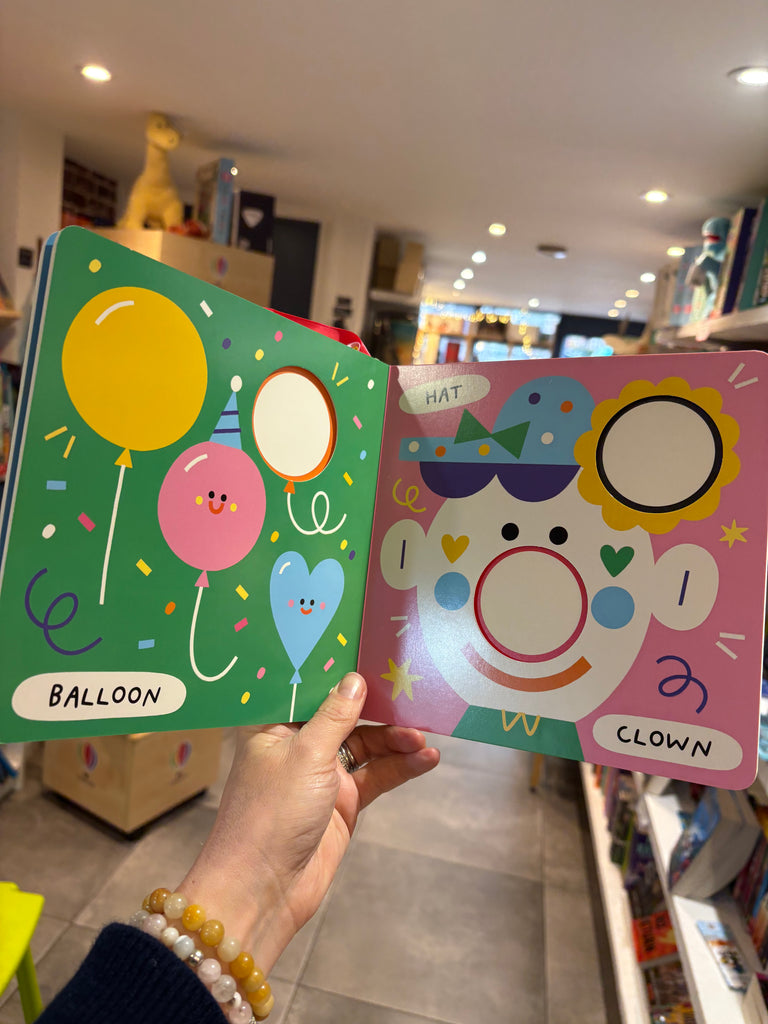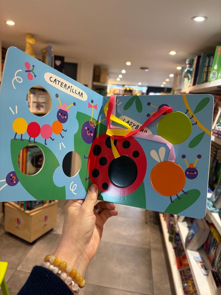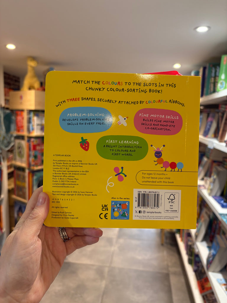 An innovative board book design that lets toddlers place three chunky shapes into matching slots. This bold, bright board book makes learning about shapes and first words endlessly fun. Three chunky circles, featuring 6 bright colours, attach to the book with colourful ribbons to create an engaging colour-sorting game, perfect for children from one to three years.