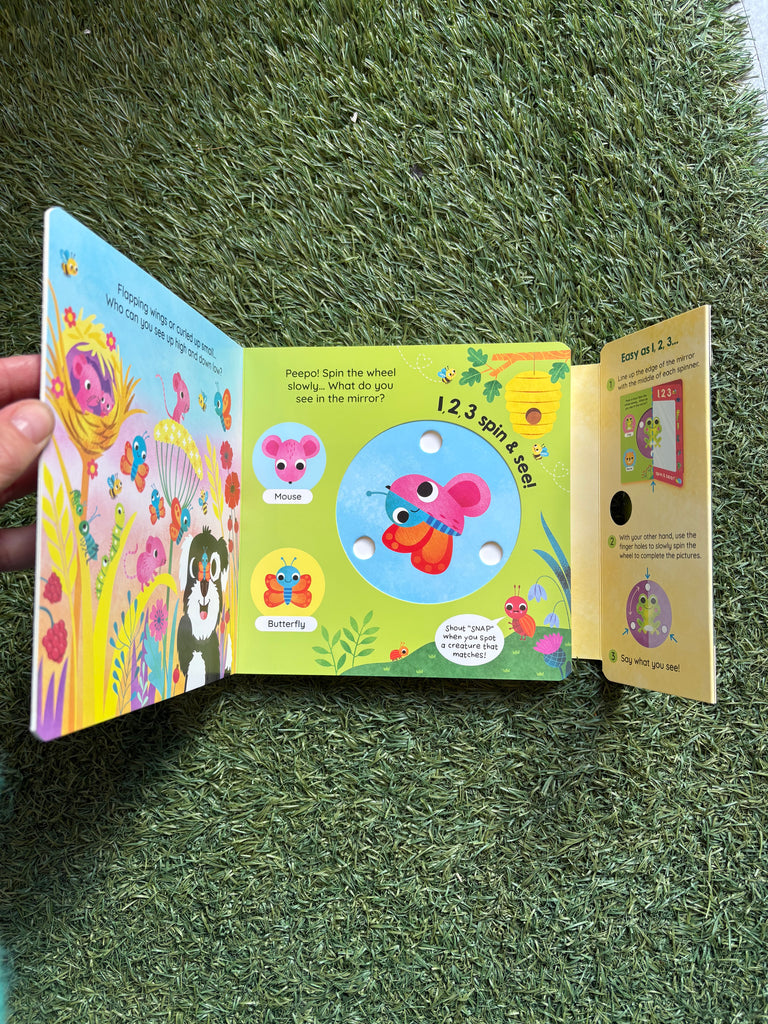 What will your little adventurer see in the magic mirror? A butterfly, mouse, rabbit and many more new friends are waiting to be discovered! Hold up the mirror, spin the wheel and find the animal reflections – it’s as easy as 1, 2, 3!