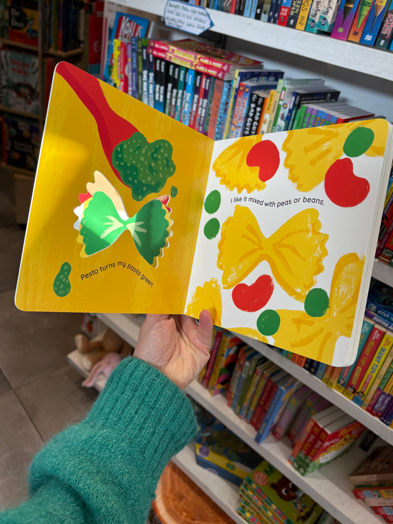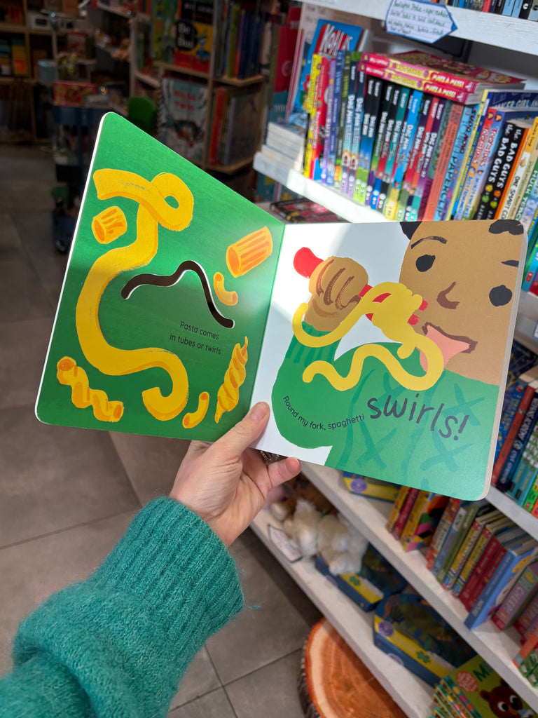 There’s only one thing this little baby loves to eat – pasta, pasta, pasta! Twisty spirals, bouncy bows, or long, slurpy strands – every shape is delicious! With sweet rhyming text, bold, bright artwork, and clever die-cuts throughout, this board book is a delight to read aloud to little ones and is sure to be enjoyed time and time again.
