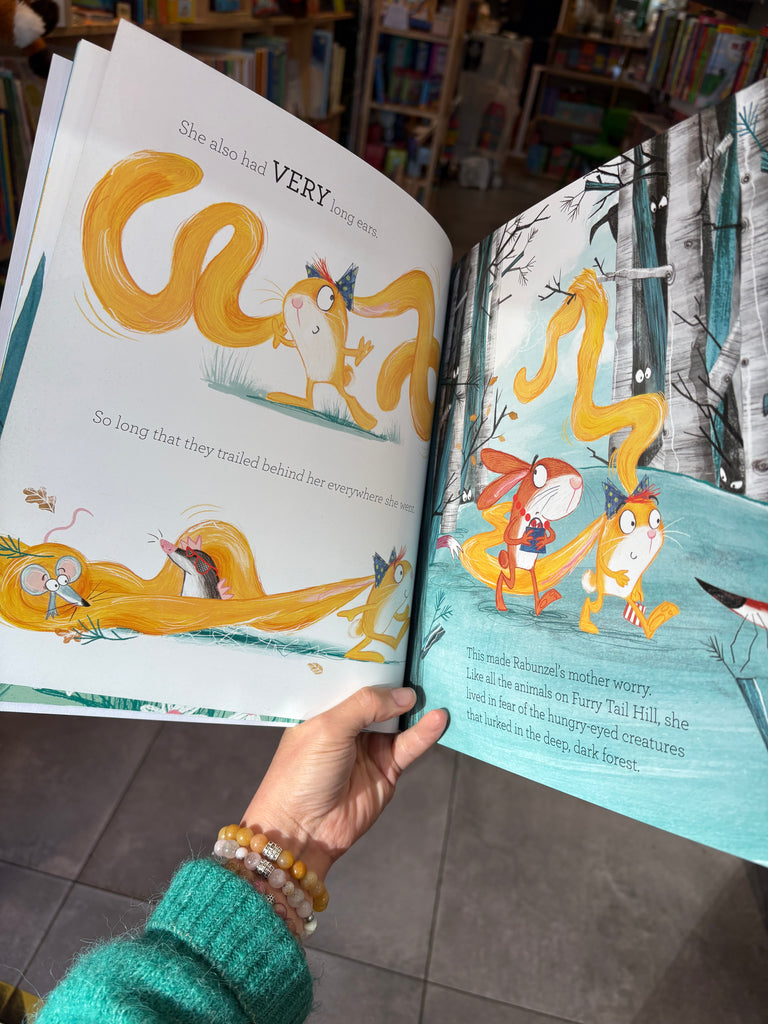 A uniquely silly and rebellious twist on a favourite fairy tale – with a fabulously foiled cover! “Rabunzel, Rabunzel, let down your ears!…” Rabunzel has a teeny tufty tail, a twitchy nose and two wide brown eyes. She also has VERY long ears – so long that her mother worries they will make her easy bait for the hungry creatures of the forest. The answer? Rabunzel must be kept safe … in towering hutch, high in the sky.