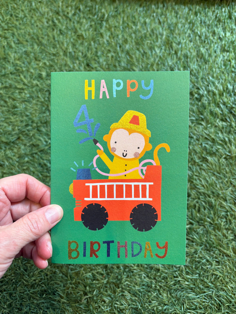 Raspberry Blossom Happy Birthday 4 Monkey Fireman Card