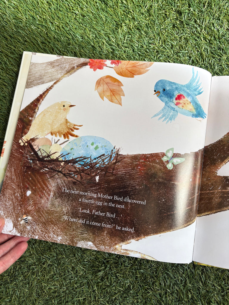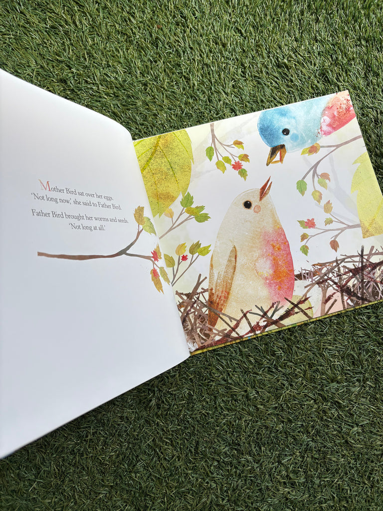 Mother Bird sat over her eggs. 'Not long now,' she said to Father Bird. Father Bird brought her worms and seeds.