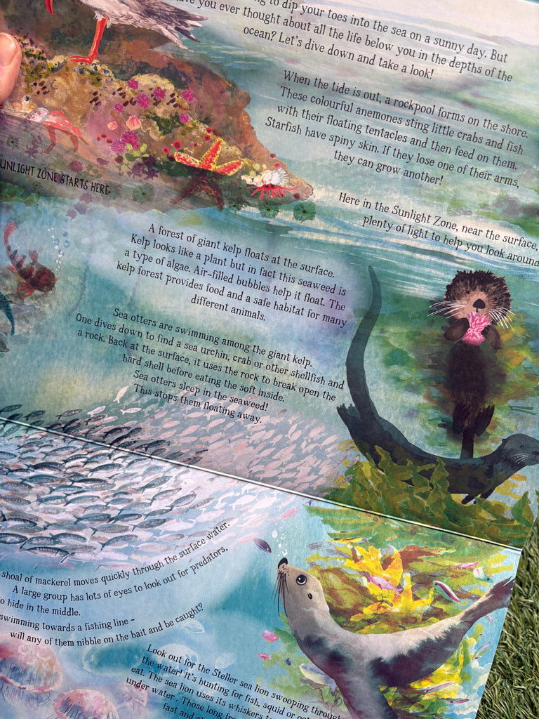 From the Look Closer series, this richly illustrated concertina book takes you on a journey through the deep dark waters, all the way down to the seabed, before floating back up to the surface. A follow-up to The Street Beneath My Feet, The Skies Above My Eyes and The World Around Me, this visually stunning book ventures to the very bottom of the sea on a journey of discovery. Through the waves and into the deep, you’ll spot all kinds of weird and wonderful marine creatures, explore the seabed and discover the impact humans have had on the underwater world. As you dive below the surface, past sea otters playing in fields of giant kelp, you will see sea lions and shoals of mackerel playing in the shallows, before passing orcas hunting in pods in the deeper water.