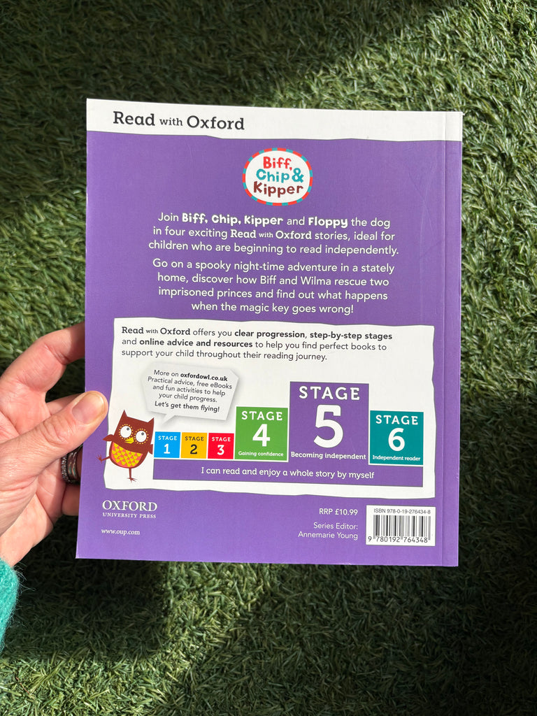 Biff, Chip & Kipper. In this Read with Oxford Stage 5: Biff, Chip and Kipper collection, children can go on a spooky night-time adventure in a stately home, discover how Biff and Wilma rescue two imprisoned princes and find out what happens when the magic key goes wrong! This collection contains four stories that are ideal for children who are beginning to read independently. There are tips for parents and fun activities throughout the book for you and your child to enjoy together. Biff, Chip, Kipper and Floppy the dog are the well-loved characters from Oxford Reading Tree, used in 80% of primary schools.