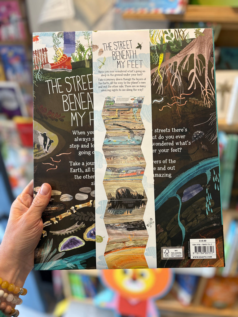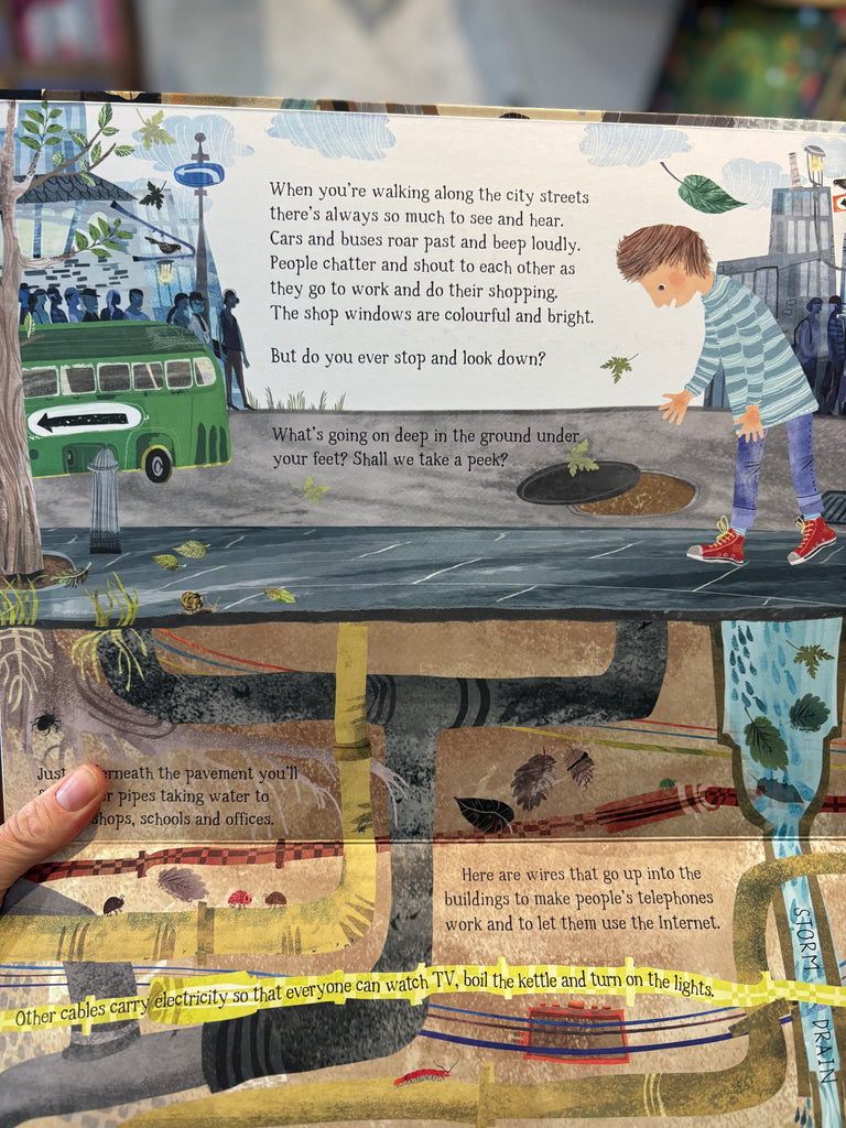This award-winning, double-sided foldout book takes you on a fascinating journey down through the layers of the Earth, all the way to the planet’s core and out the other side. *Picked by the Guardian as one of ‘15 Modern Classics’ books* When you’re out walking around, whether on the city streets or a country trail, there’s always so much to see and hear. But do you ever stop and look down? Have you ever wondered what’s going on deep in the ground under your feet? There are so many amazing sights to see! One side of the foldout shows the ground beneath the city, whilst the reverse side shows the ground beneath the countryside.