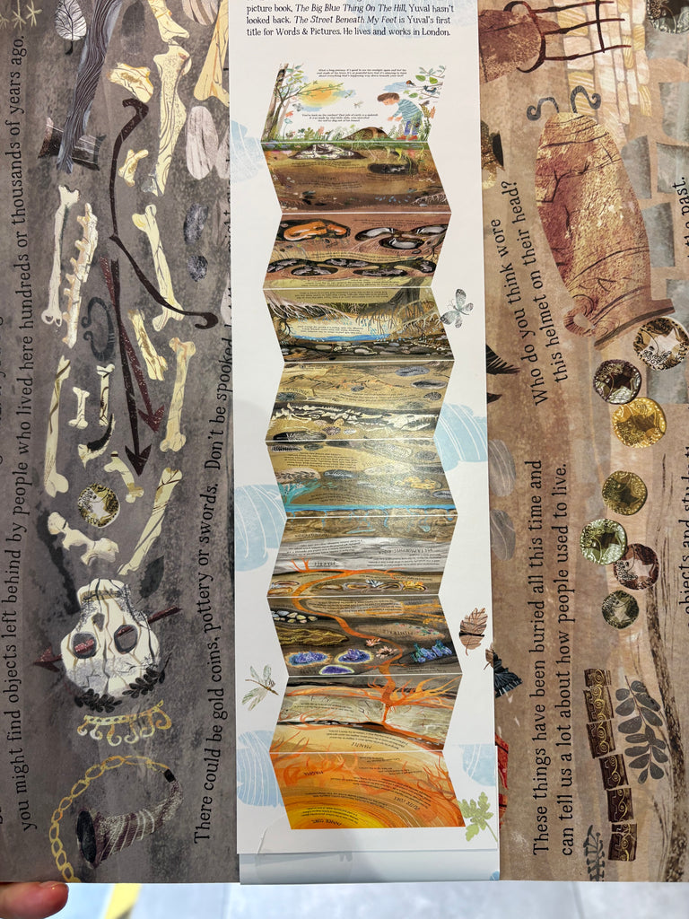 The underground scenes include tunnels and pipes, creatures’ burrows, layers of rock and the planet’s molten core, each running seamlessly into the next. Mixing urban and rural settings, covering subjects such as geology, archaeology and natural history, The Street Beneath My Feet offers children the opportunity to explore their world through a detailed learning experience. And its foldout, laperello (or concertina) style, which extends to 2.5 metres in length, is ideal for spreading out on the floor to pore over for hours.