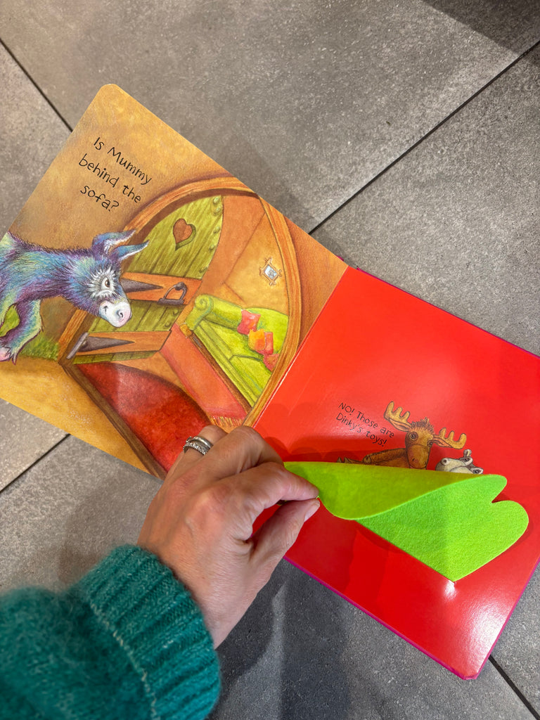 A bright and bold lift-the-felt-flap book featuring the adorable Dinky donkey!